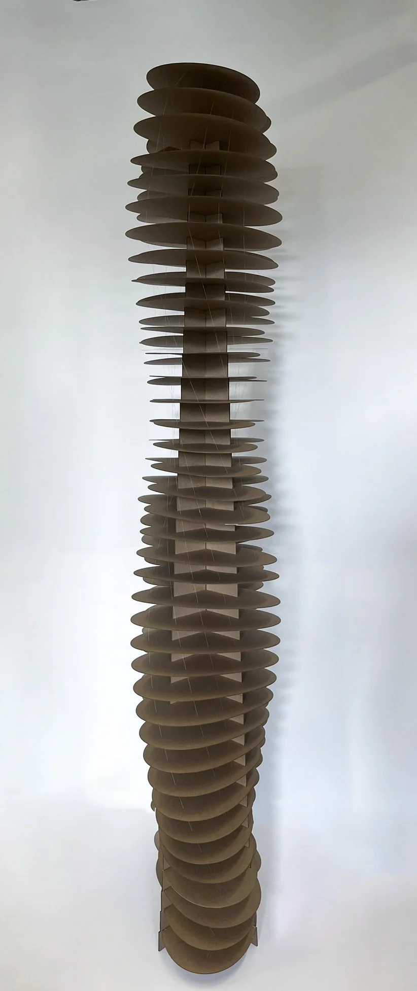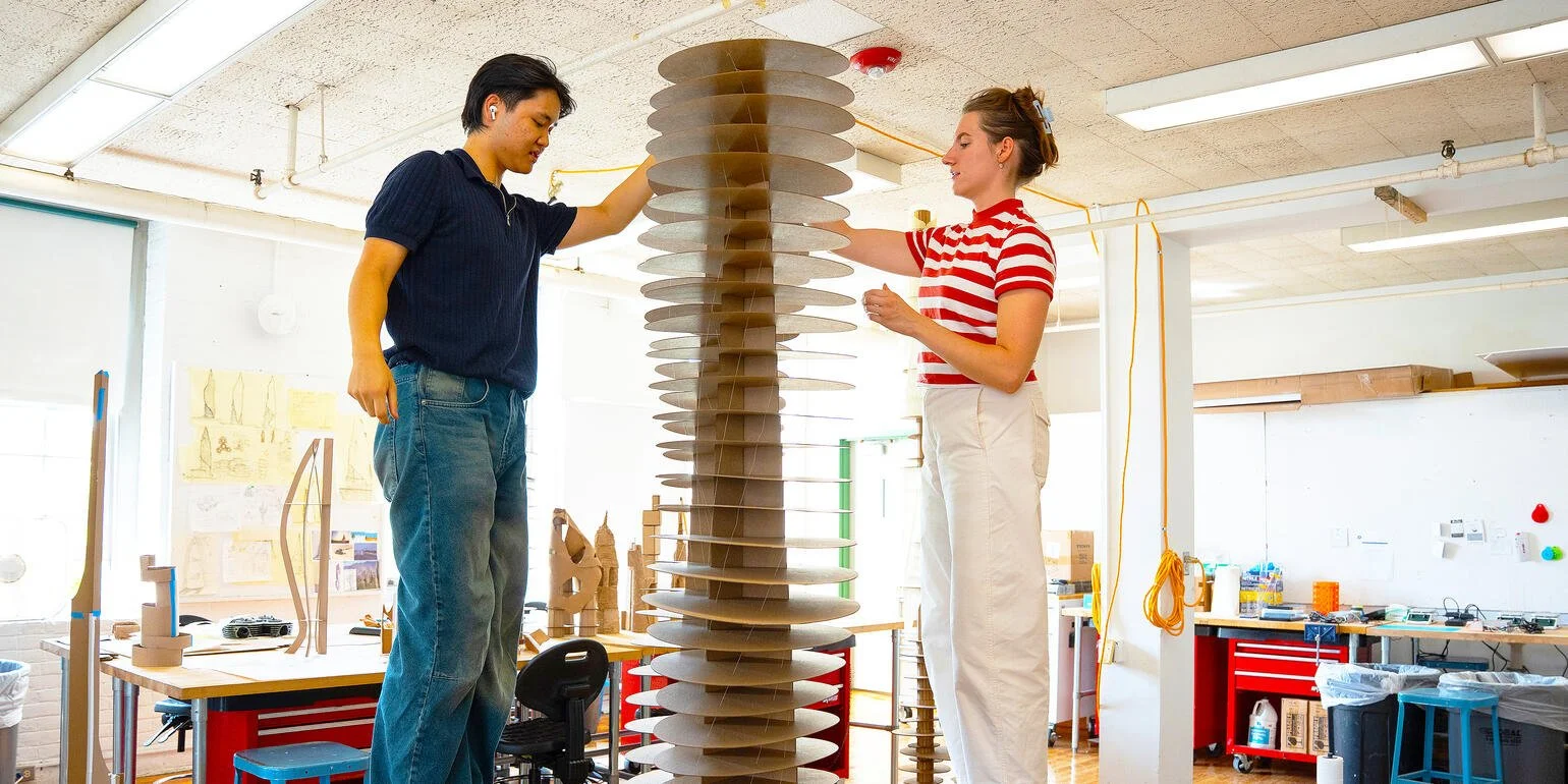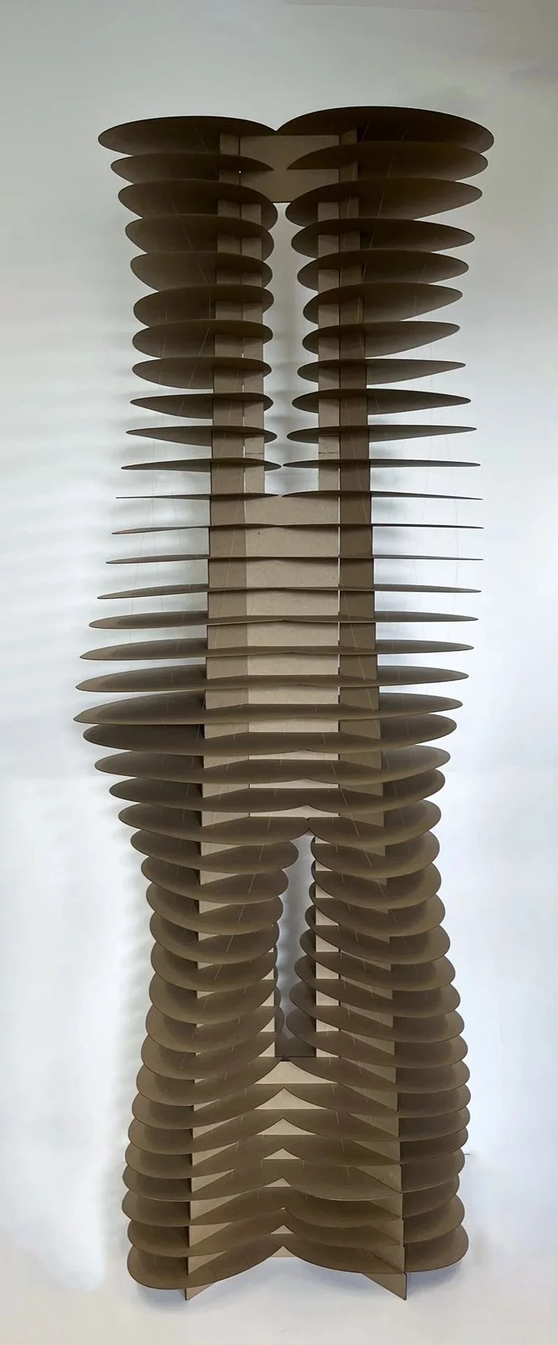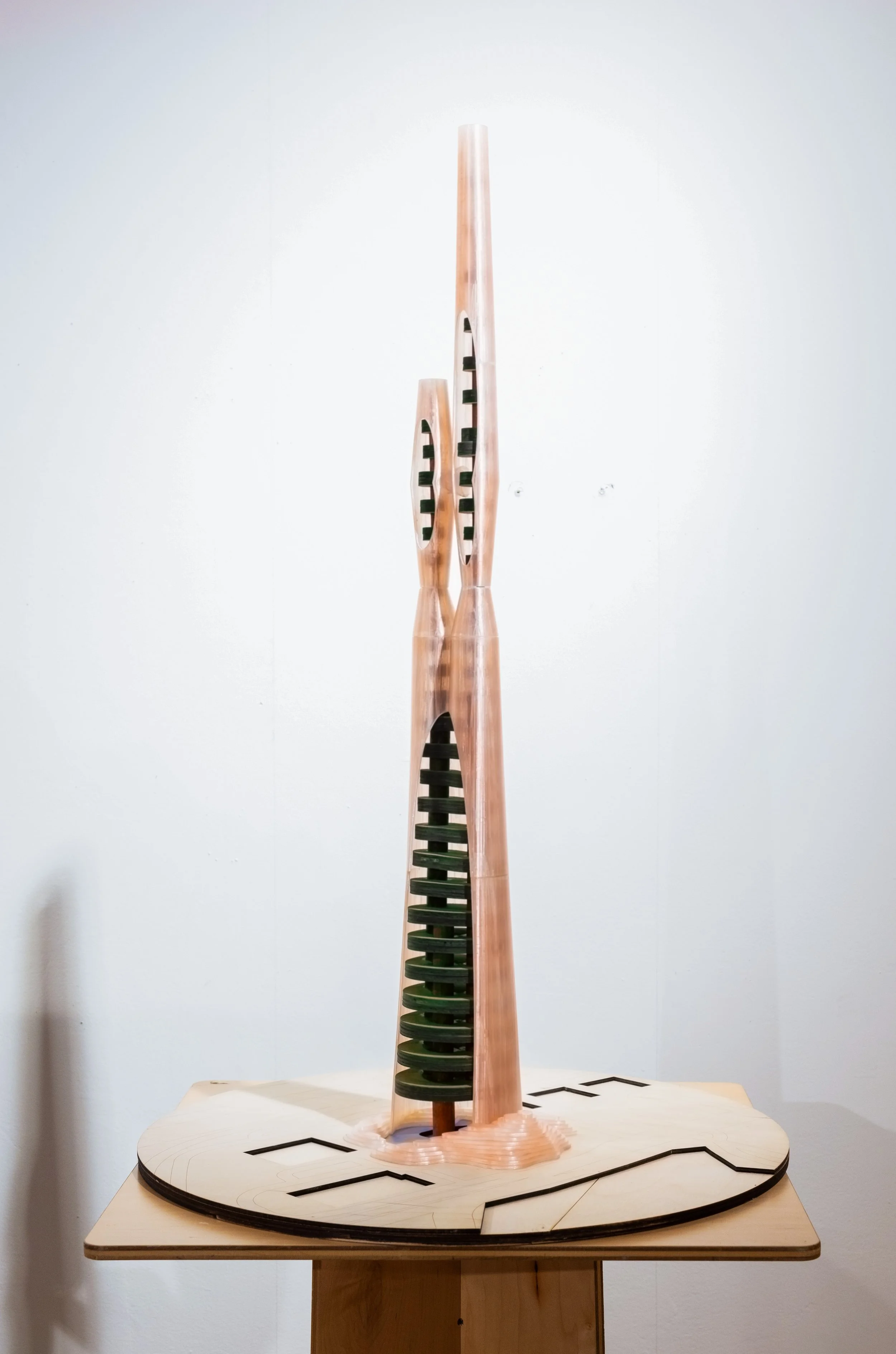The Dancing Tower is an 8-foot-tall chipboard model exploring a dynamic high-rise system that integrates structure, wind, and program. The design, organized around five buttresses which support two interlinked cores, draws structural inspiration from the Burj Khalifa. The two cores share a central buttress, creating a unified yet flexible structural system.