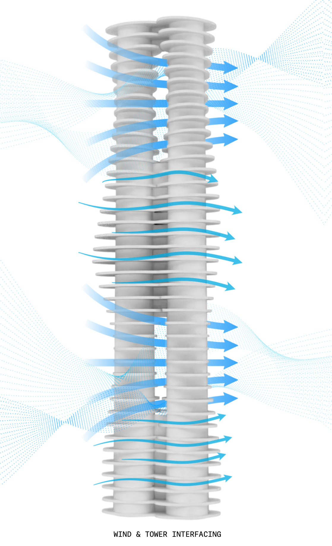 The tower is shaped to engage and harness wind, with fin-like floor plates extending beyond the building envelope to form terraces. These fins allow airflow to pass through the building edge, where it is captured by Atmospheric Water Generation (AWG) material.