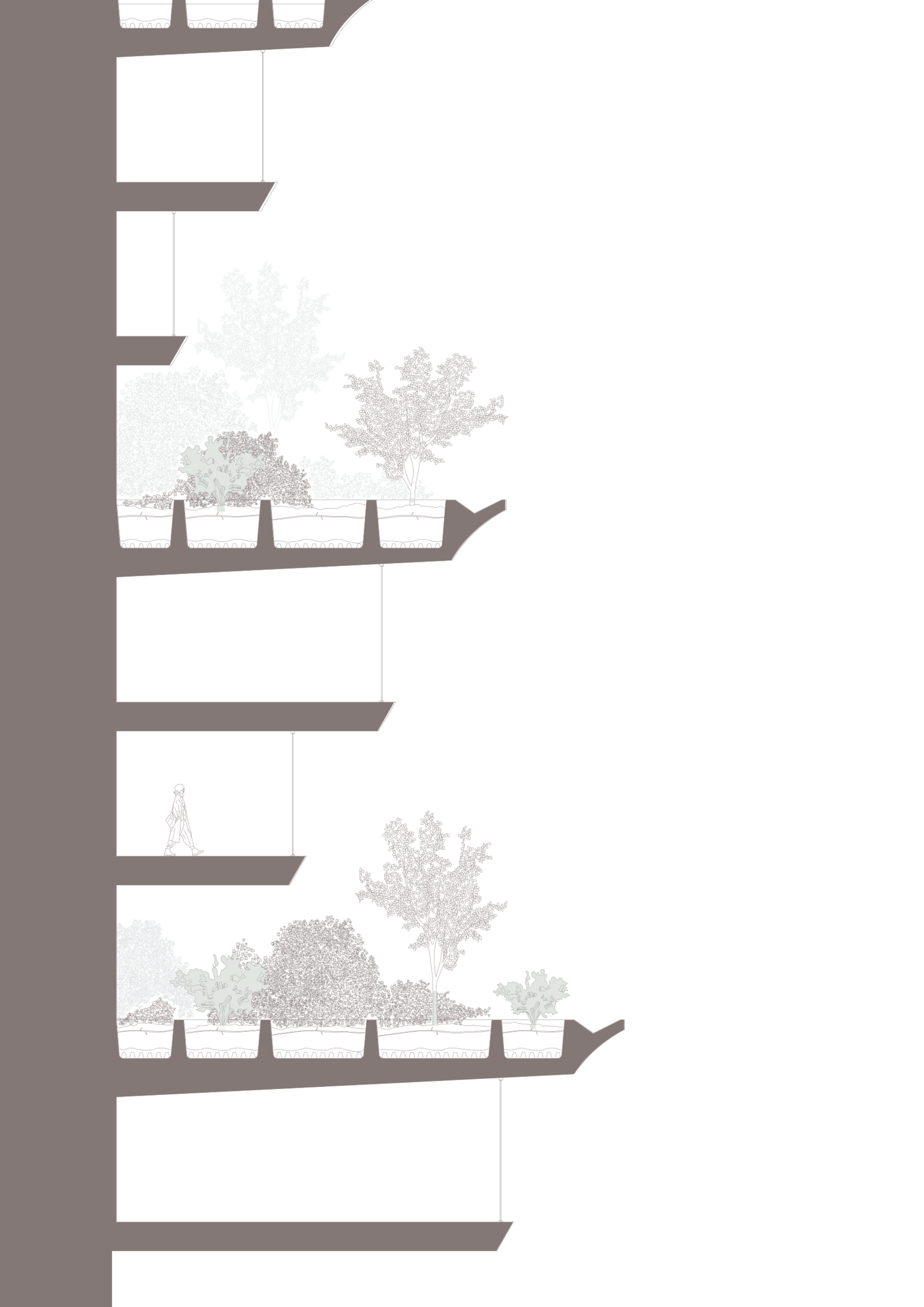 The inner layer of the façade houses the AWG modules, which collect atmospheric moisture and distribute water directly to the tower’s agricultural infrastructure. Within the building, farming and residential floors alternate vertically, creating a symbiotic relationship between human and resource. This hybrid organization also accommodates additional programming, including agricultural research facilities, commercial spaces, and educational centers.